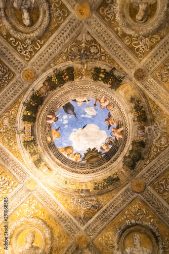3D effect of illustration decorating the center of luxurious ceiling inside medieval palace in Italy