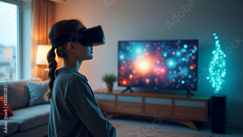 3d Flat icon as Person with a modern living room gaming console and VR headset overlay symbolizing immersive digital entertainment in double exposure with copy space. concept as A person intertwined w