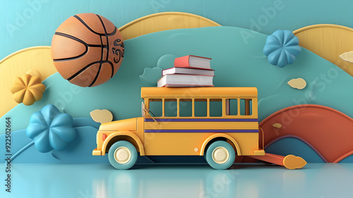 3D Flat Icon of School Bus with Basketball and Books for Academic and Physical Balance, Whimsical Background, Isolated on White Ideal for Educational Designs and Graphics