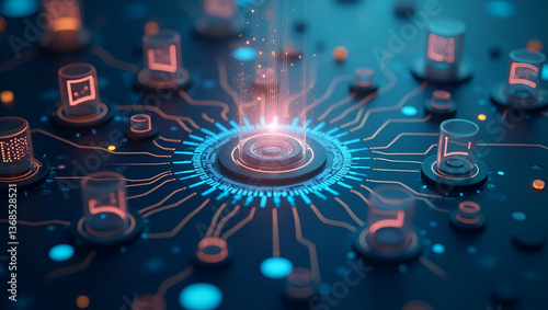 3D Flat Icon: Overhead View of Business Hub with Digital Workflow Integration