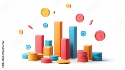 3D Floating Bar Graph with Coins - Isolated Vector for Financial Analysis and Business Growth on Clean White Background