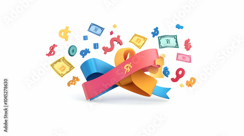 3D Floating Discount Ribbon with Currency Symbols and Advertising Icons | Stylish Vector Graphic for Effective Financial Discounts and Business Advertising Strategies | Isolated on White Background