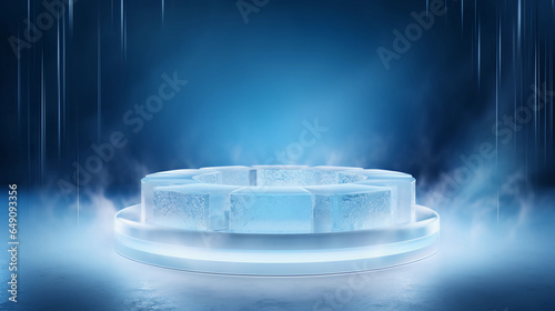 3d glass display stand for products, Ice podium for advertising with blue background, Concept of cooling, beverage and technology, studio lighting, Generative AI.
