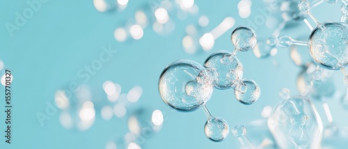 3D Glass Molecules or Atoms Floating on Light Blue Background — Scientific and Medical Concept of Biochemistry, Pharmaceuticals, Healthcare, or Beauty Technology with Transparent Molecular Structures