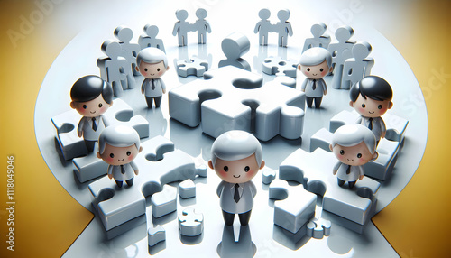 3D Glossy background with floating puzzle pieces and team icons copy space on bottom. concept as Glossy background featuring floating puzzle pieces alongside team icons symbolizing flexibility and dyn