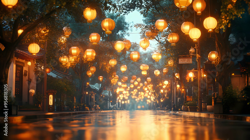 3D Glossy Lantern Festival Street Background concept as A glossy reflective street background filled with glowing lanterns hanging above creating a vibrant and festive atmosphere. The scene is set at