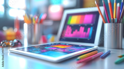 3D Glossy Tablet with Marketing Content Creation Tools & Project Outlines - Close-Up on Desk Reflecting Digital Creativity