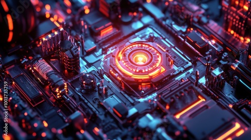 3D glow effect of a high-tech gadget with bright neon lights and intricate details, set in a dark,