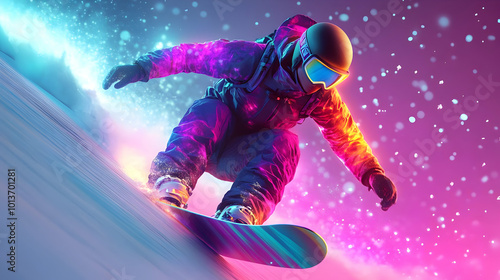 3D Glowing Snowboarder Performing Tricks on Abstract Digital Slopes � Futuristic Winter Sports Concept with Neon Lights and Vibrant Colors for Gear Promotion