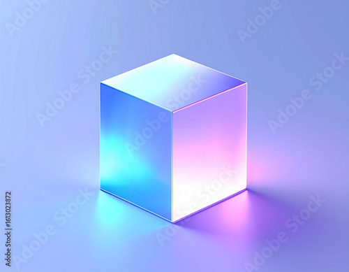 3D glowing transparent cube on blue background. Futuristic digital art cube with glowing edges and a modern holographic look on gradient background