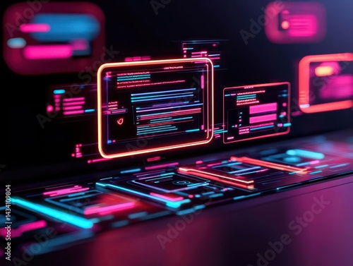 3D holographic wireframes hovering above a developers desk, futuristic UI design and crossplatform optimization concept