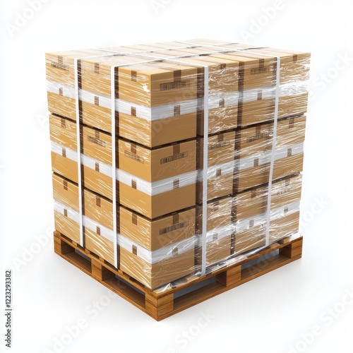 3D icon cartoon pallet stacked with boxes and wrapped in plastic, isolated on a white background -