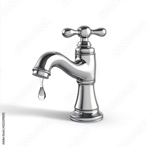 3D icon cartoon silver faucet with a single water droplet, isolated on a white background --quality 2