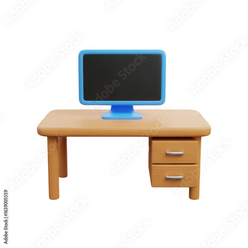 3d icon of wooden desk with a computer monitor on top isolated on transparent background