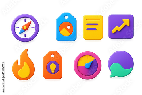 3D icon set of creative direction cues: art direction compass, photo style tag, tone guideline card, visual trend icon, creative inspiration flame, concept tag, brand vibe dial, mood style bubble.