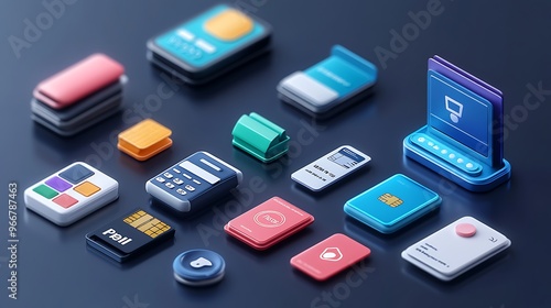 3D illustrated icon set for a shopping app, featuring icons for different types of payment methods like credit cards, PayPal, and Apple Pay with realistic and detailed designs.