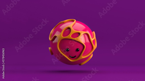 3D illustration of a cute smiling character series sphere surrounded by an organic orange structure, floating over a minimal purple background. Playful and modern realistic toy minimalist horizontal