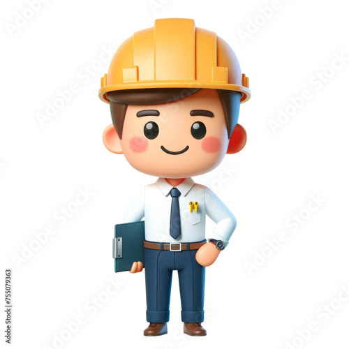 3D illustration of a cute, stylized construction worker character with a hard hat and clipboard.
