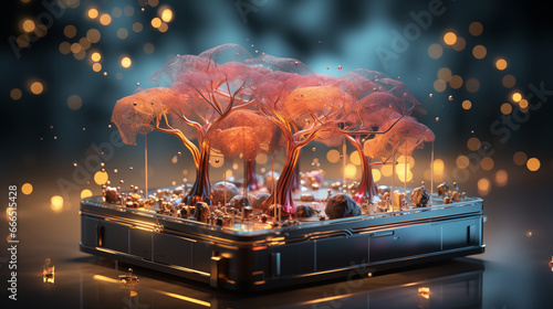 3D illustration of a futuristic science fiction landscape with trees and plants