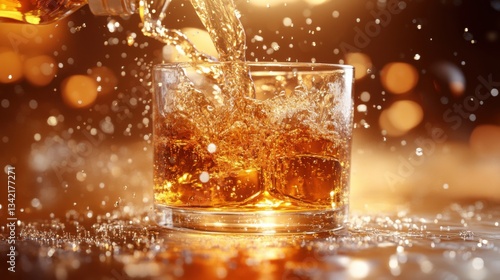 3D illustration of a glass of bourbon being poured with visible splashes, rich amber color and high detail