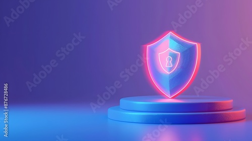 3D illustration of a neon shield with a lock icon, representing cybersecurity and data protection in a gradient blue and purple background.