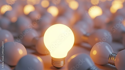 3D illustration of a standout glowing light bulb among white background bulbs, providing ample room for inserting creative writing