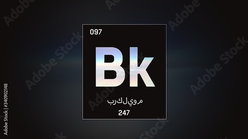 3D illustration of Berkelium as Element 97 of the Periodic Table. Grey illuminated atom design background with orbiting electrons name atomic weight element number in Arabic language
