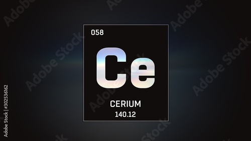 3D illustration of Cerium as Element 58 of the Periodic Table. Grey illuminated atom design background with orbiting electrons. Design shows name, atomic weight and element number