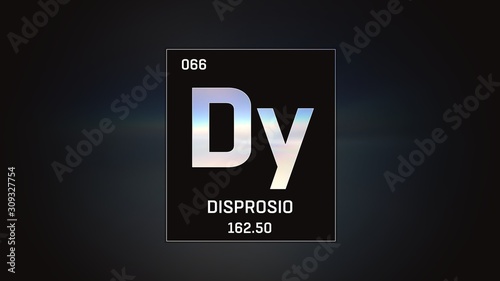 3D illustration of Dysprosium as Element 66 of the Periodic Table. Grey illuminated atom design background with orbiting electrons. Name, atomic weight, element number in Spanish language