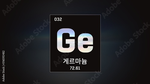 3D illustration of Germanium as Element 32 of the Periodic Table. Grey illuminated atom design background orbiting electrons name, atomic weight element number in Korean language
