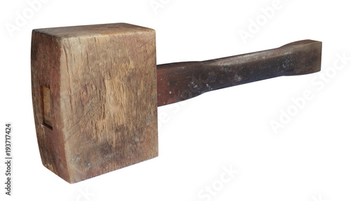 3D illustration of Grungy wooden mallet in perspective view with white background