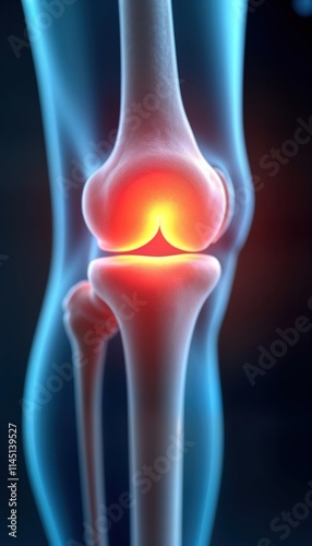 3D illustration of human knee joint inflammation pain in joint area. Detailed anatomical structure shows bones ligaments, cartilage. Digital artwork captures medical detail with colorful bone,