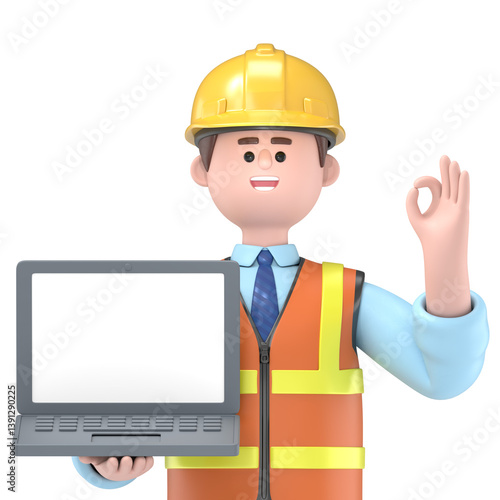 3D illustration of male engineer Owen with ok gesture showing business charts at screen laptop computer.Transparent Background Mockup.Supports PNG files with transparent backgrounds.