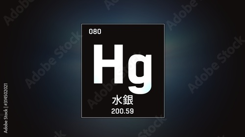 3D illustration of Mercury as Element 80 of the Periodic Table. Grey illuminated atom design background with orbiting electrons name atomic weight element number in Japanese language