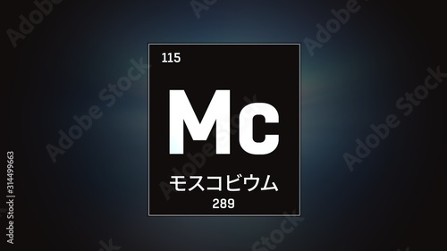 3D illustration of Moscovium as Element 115 of the Periodic Table. Grey illuminated atom design background with orbiting electrons name atomic weight element number in Japanese language
