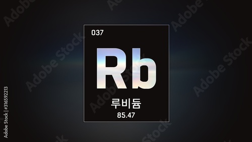3D illustration of Rubidium as Element 37 of the Periodic Table. Grey illuminated atom design background orbiting electrons name, atomic weight element number in Korean language