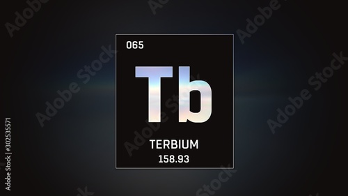 3D illustration of Terbium as Element 65 of the Periodic Table. Grey illuminated atom design background with orbiting electrons. Design shows name, atomic weight and element number