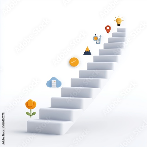 3D Illustration of White Modern Stairs with Colorful Icons Representing Growth and Achievements