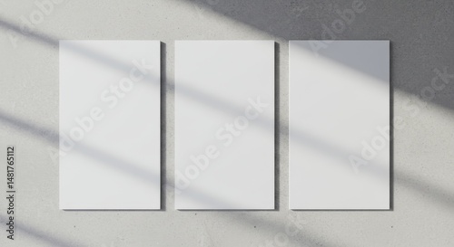 3D Illustration Three Blank White Vertical Posters Mockup On Concrete Wall With Window Shadow