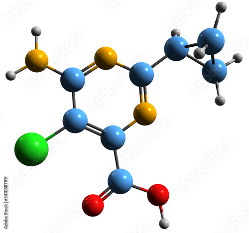 3D image of Aminocyclopyrachlor skeletal formula - molecular chemical structure of low-toxicity herbicide isolated on white background