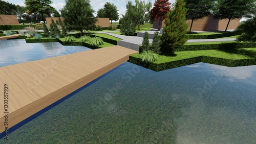3d image of the landscape design of the home territory. Landscaping of the territory. Computer visualization of composite landscaping and landscaping solutions.