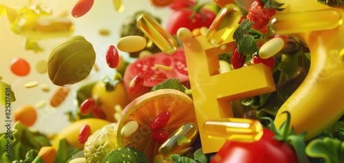 3D infographic of Vitamin E sources close up, focus on, dietary supplements, dynamic, Blend mode, vegetable garden
