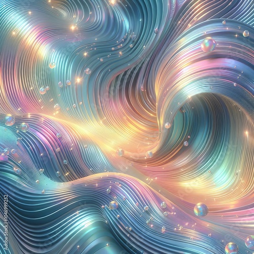3D iridescent glossy pastel rainbow water holographic ocean wave dynamic motion splash flow surface with sun glare glittering shimmering background for graphic design and wallpaper with copy space