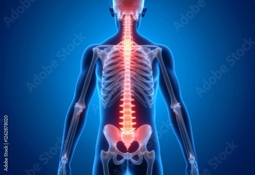 3D medical illustration of the human skeletal system from the back, highlighting the spine in red to indicate pain or injury, set against a blue gradient background