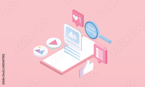 3d minimal mobile phone with social icon, Searching image and video files in database concept, document management.on pastel background