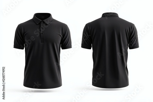 3D Mock Up of Black Polo Shirt with Front and Back Views Display, Featuring Collar and Three-Button Placket