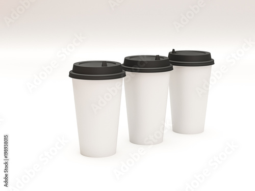 3d model of paper cups with a lid standing on a plane under natural light. White background. Rendering.