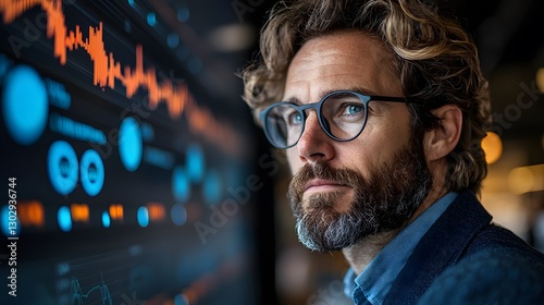 3D modern business leader reviewing progress charts on a smart digital board