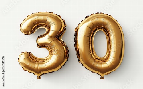 3D number 30 with Shaped Golden Foil Balloons realistic modern design, soft lighting, bright white background