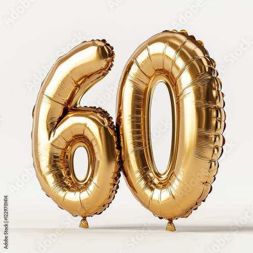 3D number 60 with Shaped Golden Foil Balloons realistic modern design, soft lighting, bright white background